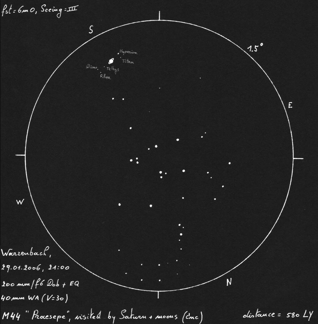 Momentan steht Saturn im Sternbild Krebs und ist in der Nähe vom offenen Sternhaufen M44 zu sehen. Am Sonntag hatten wir einen dunklen mondlosen Nacht und ich habe die schöne Stelllung am Himmel gezeichnet: